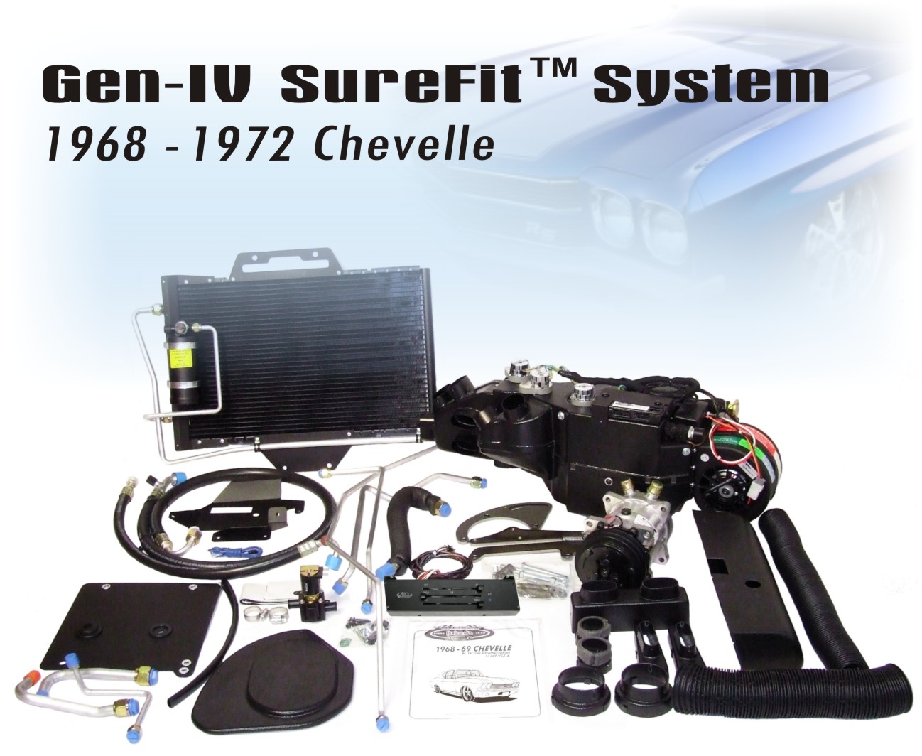 The Gen IV™ is Vintage Air’s most powerful and intelligent climate control system. The Gen IV uses an exclusive fully electronic microprocessor control system eliminate cables or vacuum connections. Separate high capacity copper parallel-flow heat coil and aluminum plate and fin cooling coils provide outstanding performance and instant temperature adjustments. This new Chevelle Sure Fit ™ system includes a backlit three-lever control panel that bolts in the stock dash location. Additional features include variable blower speed and dash/floor/defrost blend . Sure Fit Systems are engineered specifically for each vehicle application and require absolutely minimal alteration to the vehicle for installation.