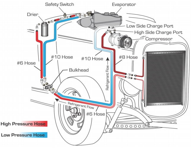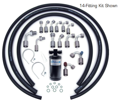 All Vintage Air line kits use barrier type refrigerant hose for use with HFC-134a and R-12 refrigerants. Includes adequate hose length to connect most universal systems, 14 or 10 assorted O-ring fittings, and refrigerant oil. All hose kits include fittings with service ports. Includes: 6ft. of #6, 4ft. of #8, 5ft. of #10 barrier hose. Standard or extra-length kits available.