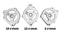 Alternator brackets are designed to accept the popular G.M. alternators, both internally and externally regulated. These include the 10SI, 12SI, and the newer CS130. On the 12 o'clock alternators, the center to center of the mounting holes must be 6-9/16" for use with our brackets. The CS130 alternators are slightly smaller in diameter than the 10SI and 12SI alternators, and are available with three different mounting ear locations as shown below. These mounting ears use a metric bolt. Our standard bracket will normally work with the CS130, 12 o'clock alternator. We can supply some brackets for the 10 or 2 o'clock alternators on a special order basis. The 2 o'clock ear is usually used on low applications, where the alternator is turned upside down. The CS130 Alternators were used on late 1980-2000 G.M. applications. The 2 o'clock alternator was used with all 2.8L V-6 applications in the late 1980's (S-10, Astro Vans etc.). The 10 o'clock alternator was used on Chevy Caprice from the late 1980's to early 1990's, and Chevy Trucks from the late 1980's to 2000. The 12 o'clock alternator was used on the 1989-93 big block Chevy applications.