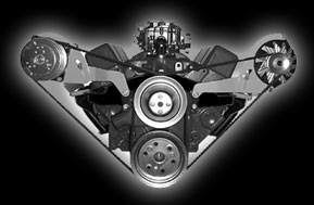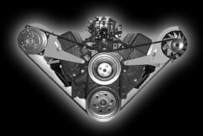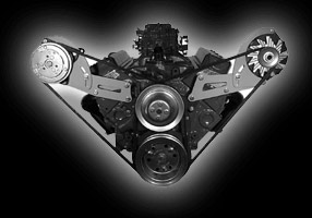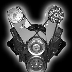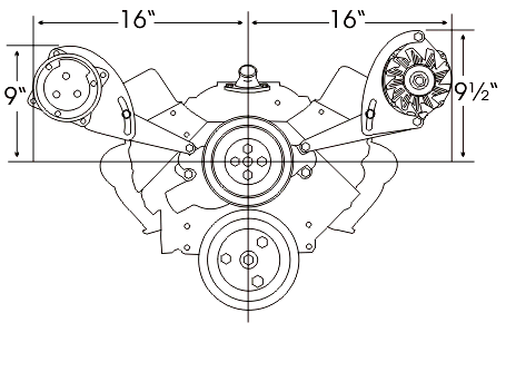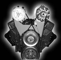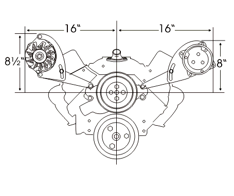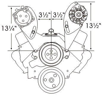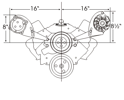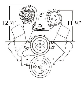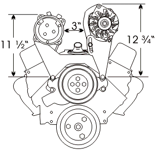 A very versatile street rod style bracket system. Works well with most induction systems. Will clear multiple carbs, fuel injection, etc. Bolts to the head and top water pump bolt holes. The alternator bracket will fit all 1969 and newer heads. The A.C. Compressor bracket fits all G.M aluminum heads including the fast-burn aluminum heads and may be used on 1969 thru 1986 cast iron heads by drilling and tapping one hole for the upper mounting point. Will clear up to 3 in. tall center bolt valve covers when used on 1987 and later heads. Will clear up to 3 3/4 in. tall valve covers when used on 1986 and earlier heads. |