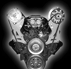 Our MOST POPULAR BRACKETS. Bolt to top water pump and the two front intake bolts. May be used individually or as a pair. Will clear tall valve covers. NO DRILLING OR TAPPING REQUIRED. |